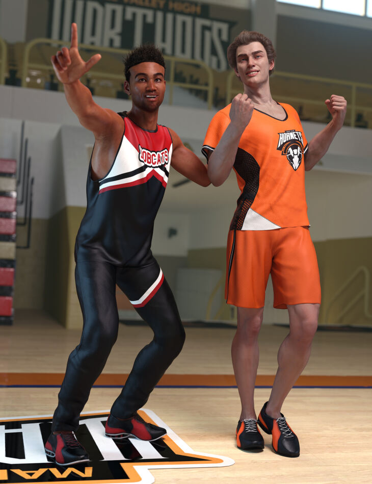 The dForce Cheerleading Squad Outfit for Genesis 8 and 8.1 Males Bundle is great for your next male character. Mix and match the shorts, tops, and pants to fit your needs for whatever team you think will make it to the winning game.