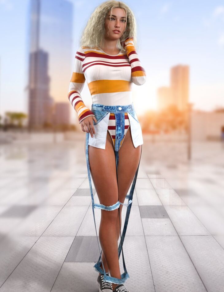 The dforce Cut Out Jeans Outfit For Genesis 8 and 8.1 Females is a modern outfit consisting of a bodysuit and extreme cut out jeans. It comes with 17 elegant and modern textures.