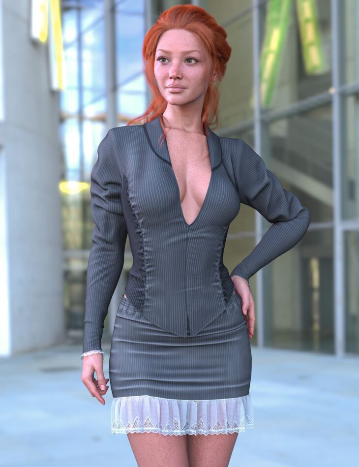 The dForce Dainty Outfit for Genesis 9 is a chic, cute and trendy combination of a mini skirt and a puffy sleeves jacket.