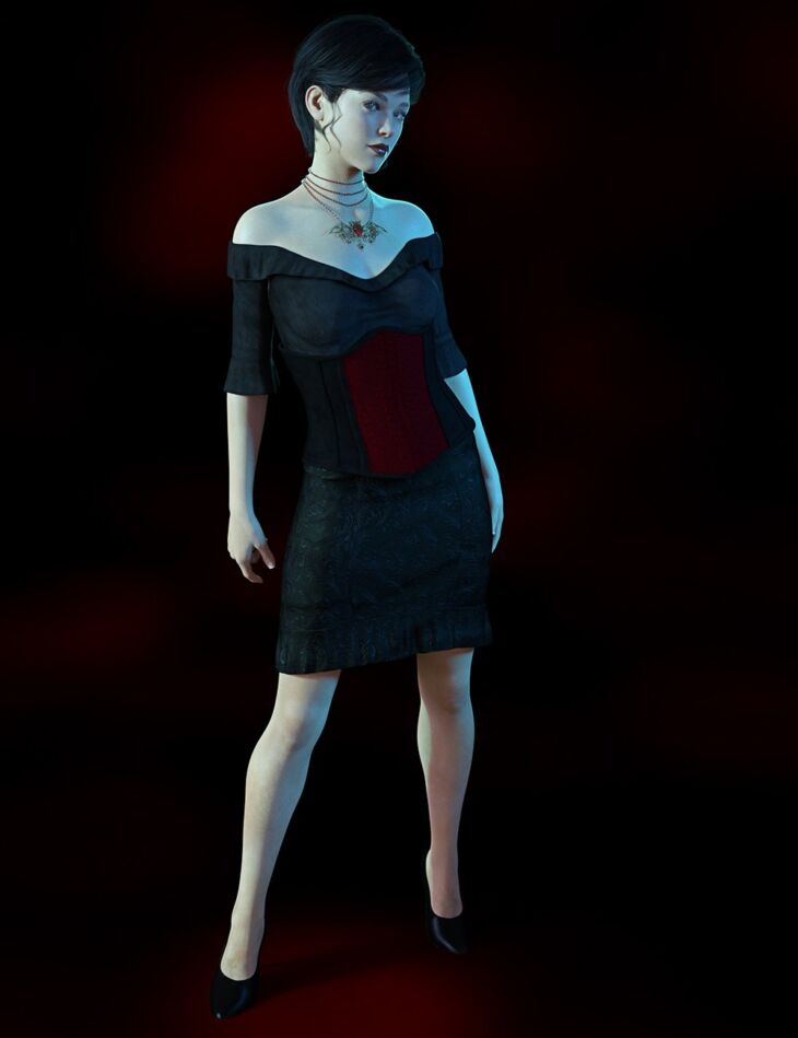 Whether she's an immortal temptress or a gothic queen of the night, dForce Dark Shadows for Genesis 8 Females outfit is sure to add that perfect touch of darkness to your renders. The set includes a beautifully detailed top, skirt, boots, corset, and bat shaped necklace.