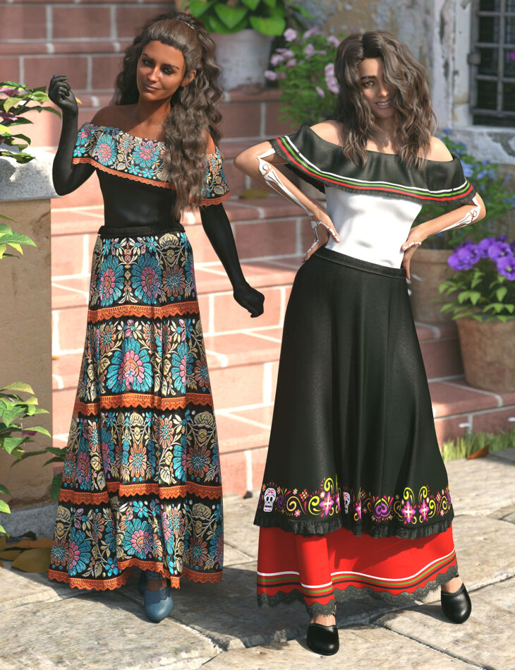 The dForce Dia de los Muertos Outfit Textures set includes a variety of festive and colorful options for the dForce Dia de los Muertos Outfit for Genesis 8.1 Females.