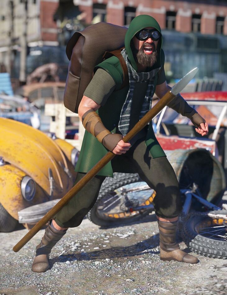Nice post apocalyptic set for Genesis 8 Male that contains a T-shirt, pants, hoodie, scarf, backpack, gloves, boots, goggles and a staff.