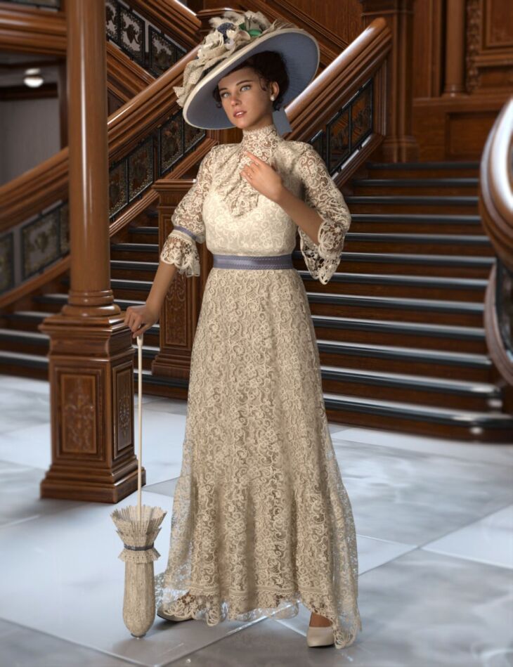 The romance of the Edwardian era fashion highlighted graceful, high-necked dresses, large elaborate hats, and dainty parasols. Evaline outfit for Genesis 8 and 8.1 Females beautifully portrays this era perfectly.