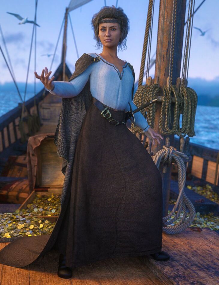 dForce Fair Tides Outfit for Genesis 8 Female(s) is great for your female character. Whether she's a Viking warrior a beloved Pirate Queen or backing up her companions as a mage in a dungeon crawler this set has it all.
