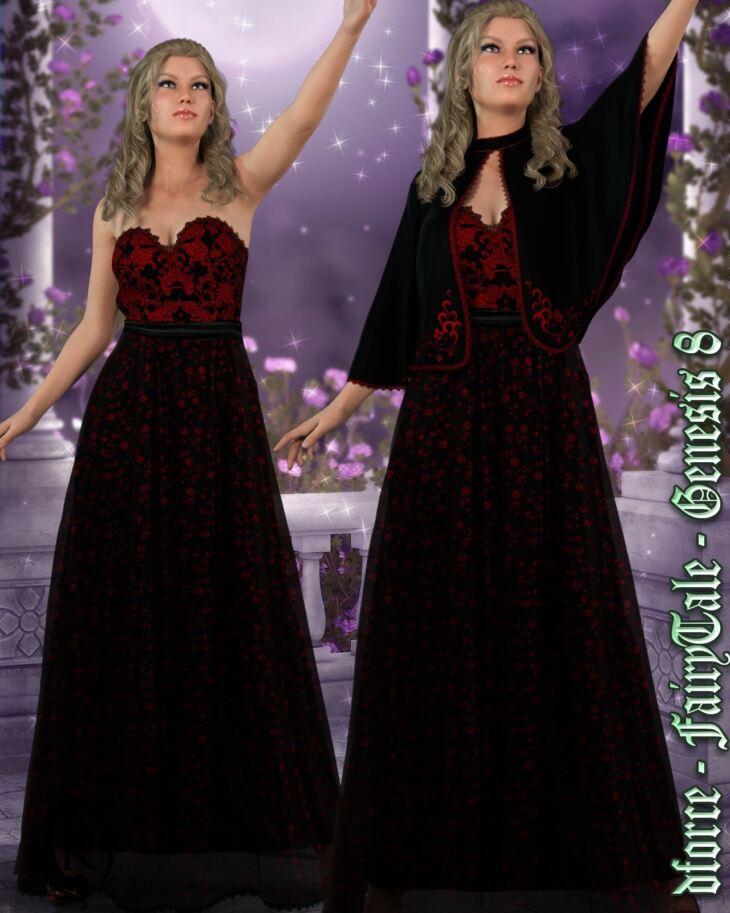 Once Upon a Time... Take your princess back to a time where fantasy and magic exist in this beautiful Fairytale dress and cape for Genesis 8. dforce is required.