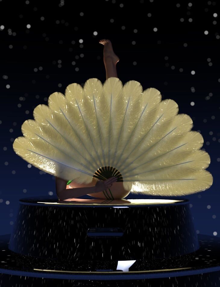Fan Dance Collection is a set of Feather Fan figures, dForce Outfits, and Poses for use with Genesis 9 and Genesis 8 Female figures in Daz Studio using Iray.