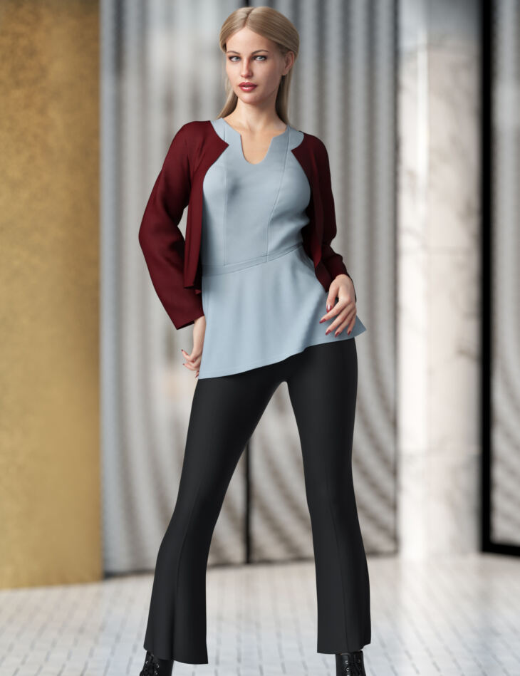 The outfit parts come with dForce enabled for realistic draping, and the blouse can be styled longer to look great as a dress, with sleeves that can be hidden for more variety.