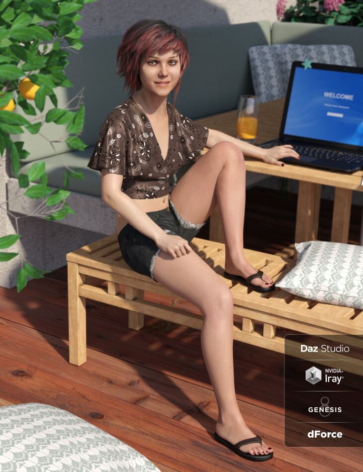 Easy breezy summer outfit for Genesis 8 Female(s) that includes a dForce compatible Top, Shorts, Shoes, and Navel Ring.