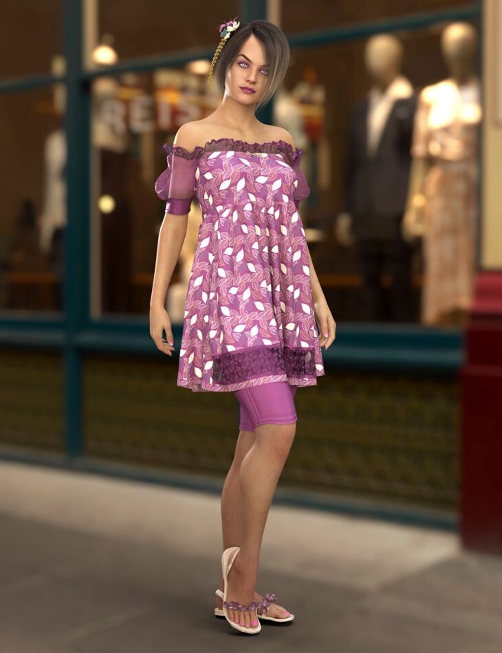 The dForce Gabriella Outfit for Genesis 8 and 8.1 Females is a super comfortable and versatile outfit and can be styled in many different ways. The outfit consists of a puffy off-shoulder dress/top with lace detail, biker shorts, flower sandals, and a matching flower head accessory.