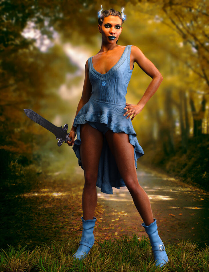 The dForce Gaby Outfit for Genesis 8 and 8.1 Females consists of 4 different wearable props: boots, flower horns, bodysuit, and skirt.
