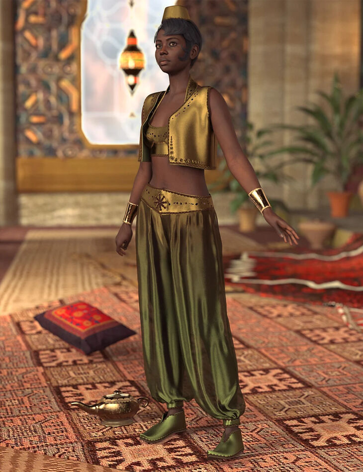 A beautiful dForce Genie outfit for Genesis 9, complete with 6 texture sets. For a bonus, we have included a genie lamp prop and two cushion props.