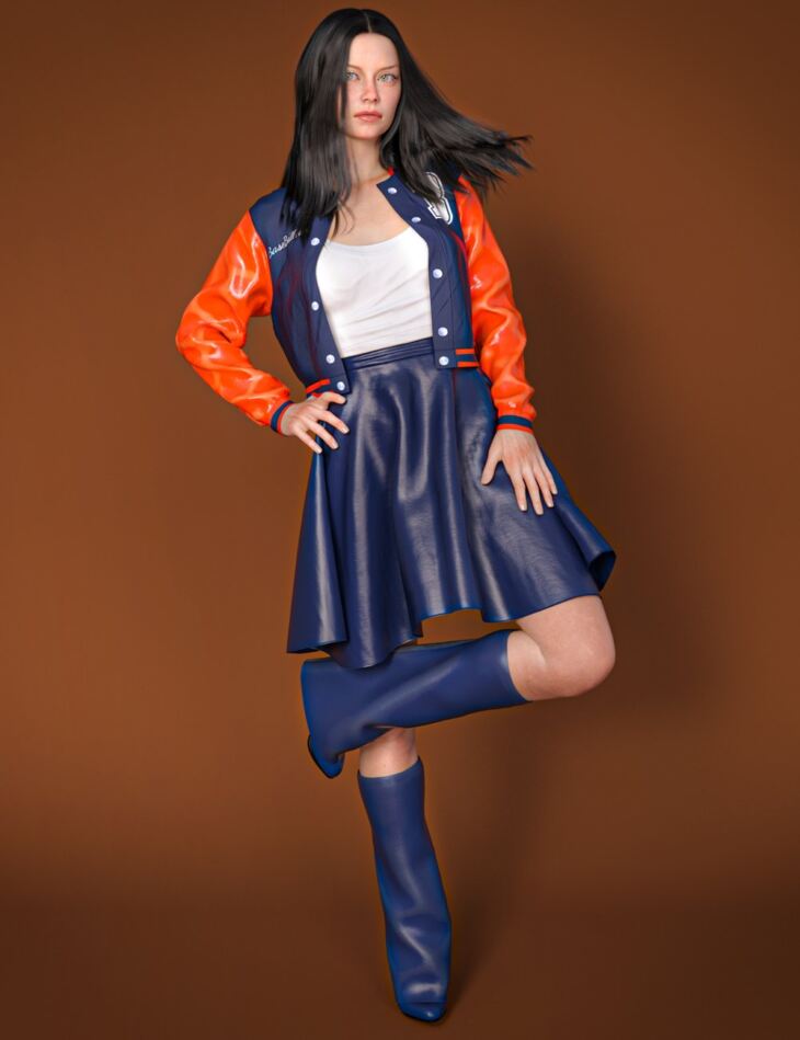 The dForce Girls Baseball Style Outfit for Genesis 8 and 8.1 Female is a fashionable baseball-inspired uniform consisting of a jacket, skirt, top, and boots. It also contains a variety of colors and textures that will help you bring your renders to life.