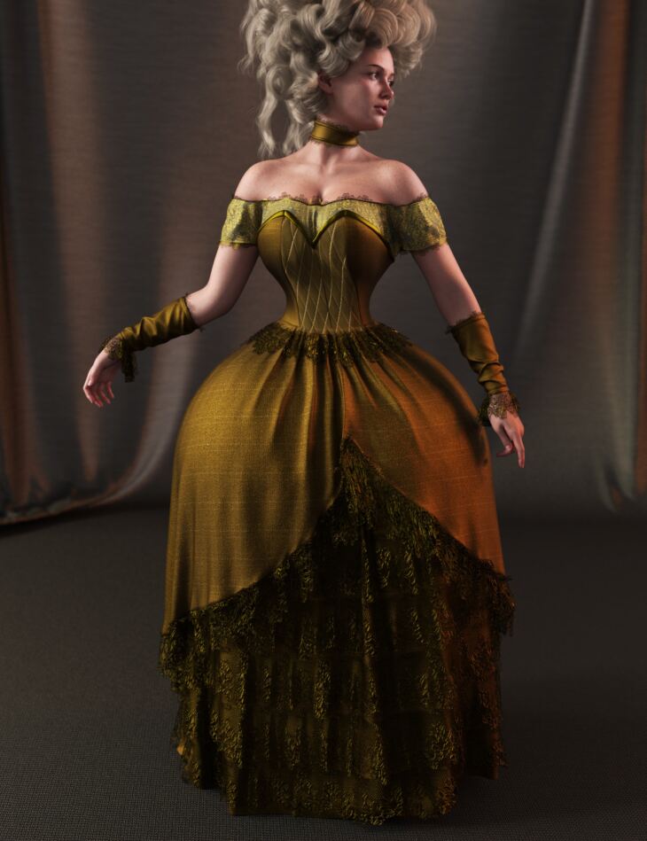 This gown is intended to be used with dForce simulation. Due to the voluminous shape of the skirt, leg posing is limited. It is not meant to be used with sitting poses.