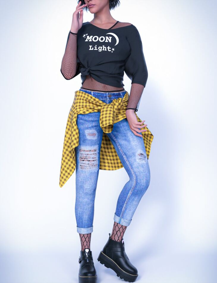 The dForce Grunge Fashion Outfit is a casual outfit for Genesis 9, complete with realistic jeans, 3 shirts with different styles, fishnet stockings, and boots with a variety of different colors and textures.