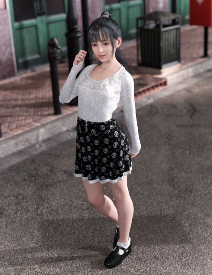 This is a casual everyday outfit set for young Genesis 8 and 8.1 Females, including a shirt, skirt, and shoes. The set comes with 5 color options for the shirt, 9 color options for the skirt, 5 color options for skirt lace, plus 2 color options for Shoes and socks.