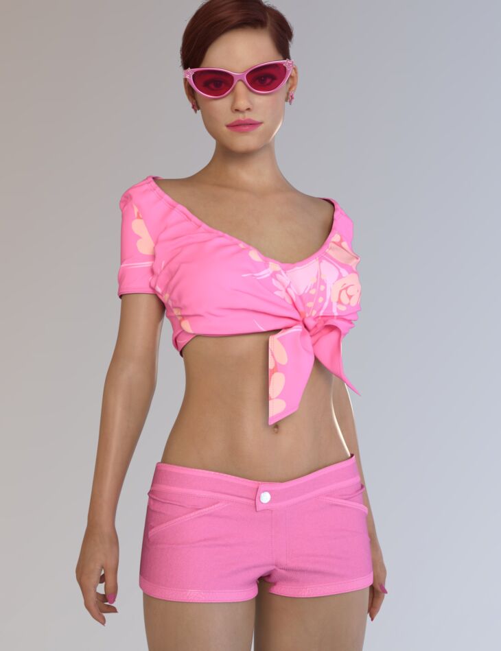 The dForce Heidi Outfit for Genesis 8 and 8.1 Females is a flirty and fashionable outfit that consists of various items. Included are a funky, knotted top, "hot" shorts, sunglasses, and a pair of matching earrings.
