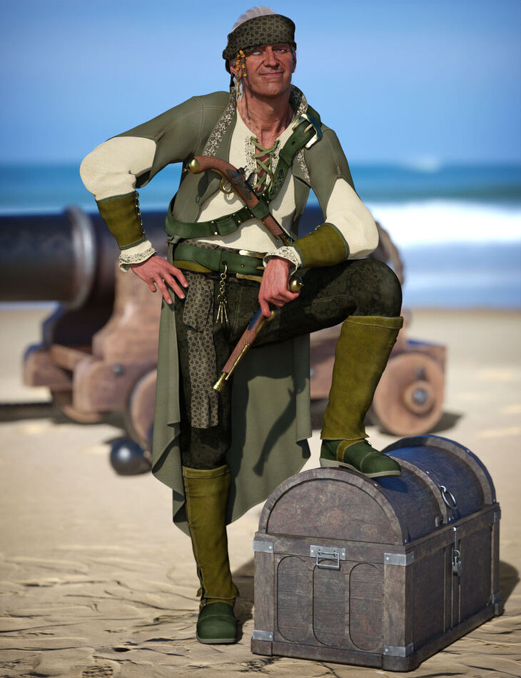 Embark on an ocean quest in the dForce High Tides Outfit for Genesis 8.1 Males. This complete outfit comes with a jacket, head covering, shirt, pants, boots, chest belt, pants belt, and a flintlock pistol. Who knows what creatures and fiends you'll encounter!