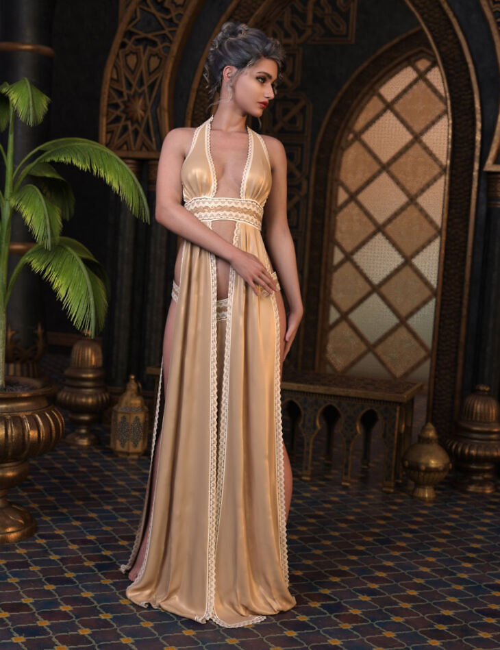 This beautiful outfit has a rigged draped skirt to allow custom movement of the drapes, before or after simulation.