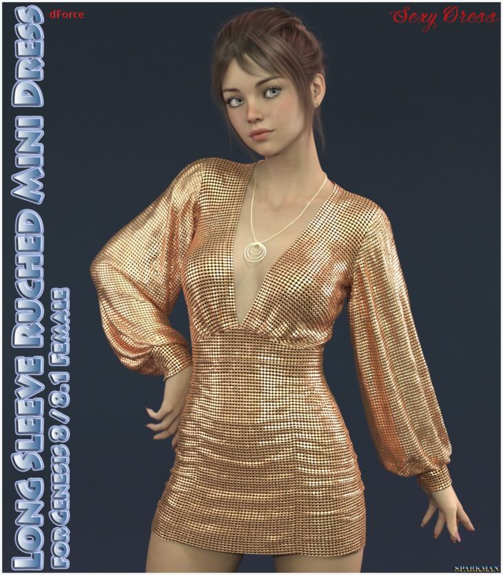 This product is represented by one piece of clothing - dForce Long Sleeve Ruched Mini Dress, and complemented by 15 IRAY materials for dForce Long Sleeve Ruched Mini Dress and more morphs.