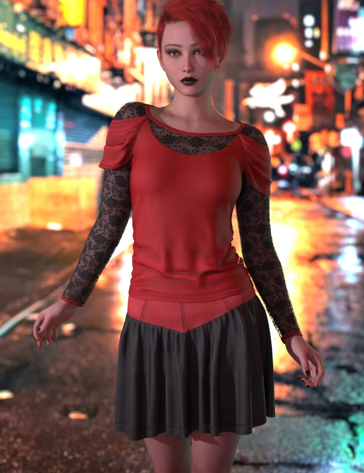 The dForce LV Emo Style Outfit for Genesis 9 consists of a lace and cotton t-shirt knit long sleeve top with cap-sleeve detailing, in trendy dark colours and black; as well as a denim weave and polyester skirt with V front waistband in dark colours and black, with the option of plain or polka-dot skirt bottom.