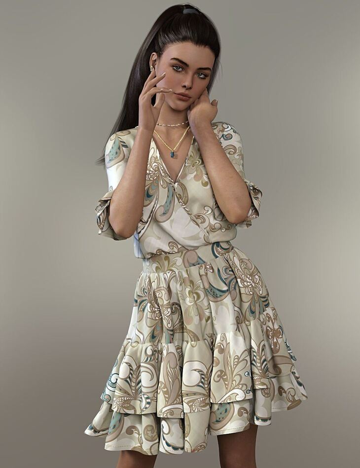 With 6 different textures, the dForce Maia Outfit for Genesis 8 and 8.1 Females is fun, flirty, and stylish for summer days. It comes with ear cuffs, a pearl choker, and a necklace with stones to match each texture and complete the outfit. The necklace pendant can be adjusted by choosing it and going to the parameters tab. The dress was designed for dForce but can be used with gentle poses as conforming.