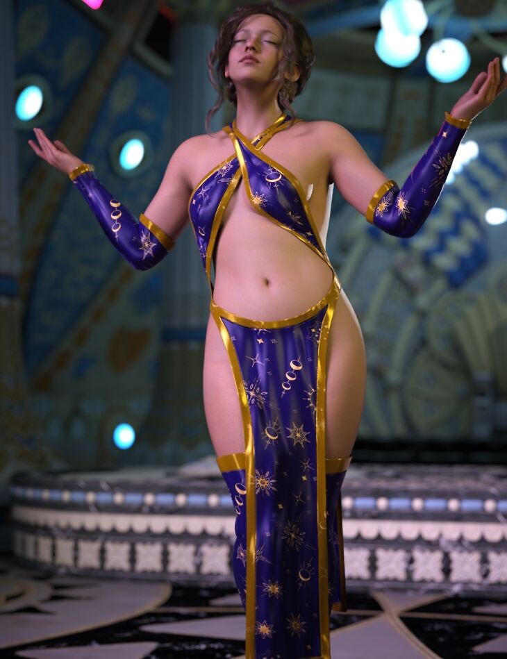 This Outfit consists of a Dress, Sleeves, and Leggings for the Genesis 9 and Genesis 8 Females, along with a selection of material, shader, and dForce presets.