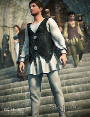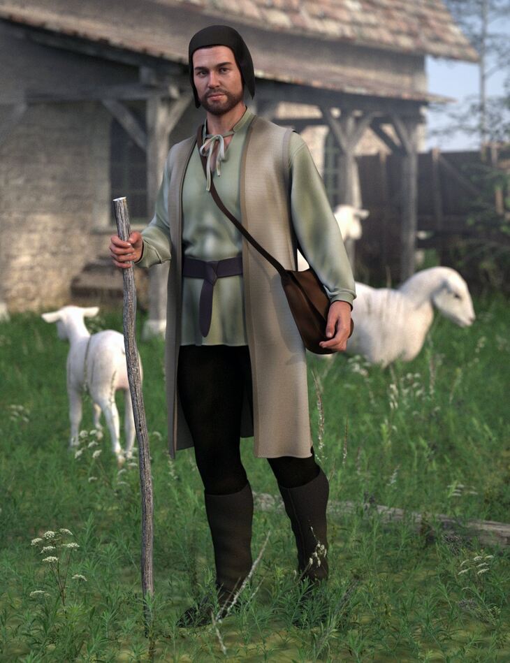 Medieval Peasant for Genesis 8 Male is a set of basic yet functional period style outfit for Genesis 8 Males that includes Pants, Tunic, Vest, Belt, Bag, Boots and a Headpiece.