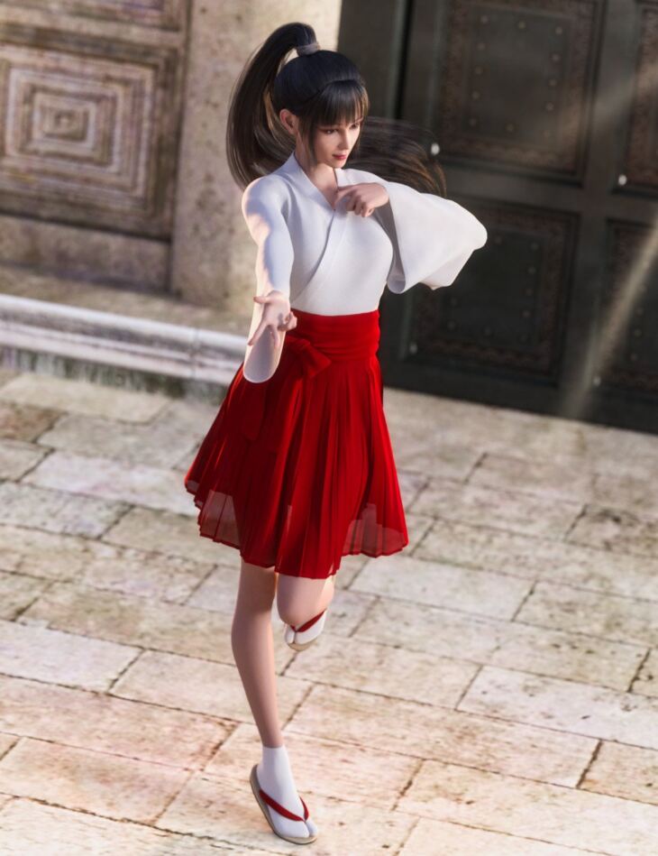 This is a Japanese Shinto Priestess outfit set for Genesis 8 and 8.1 females, including a skirt, socks, and sandals. The outfit comes with 5 color options for the shirt, 6 color options for the skirt, 3 color options for socks, and 5 color options for sandals.