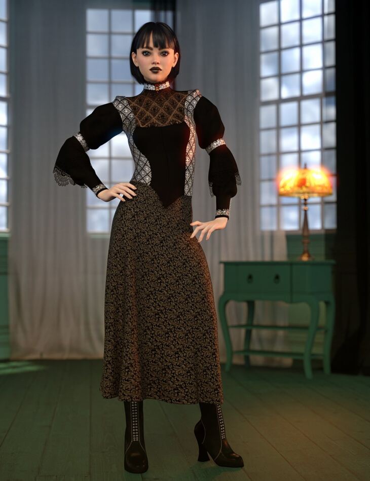 The dForce Millicent Outfit takes you back to the days of dark wood paneling and lace curtains. This outfit has everything you need to be ready to take over the world: a skirt, blouse, boots, and a brooch. It's got five different texture sets so you can mix and match textures for each outfit.
