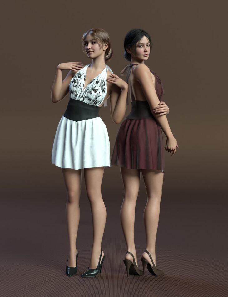 The dForce MK Mini Wrapped Halter Dress for Genesis 9 is a stunning costume designed for Genesis 9 figures. This package includes a mini wrapped halter dress and a pair of heels. The dress is available in 10 vibrant and eye-catching colors.