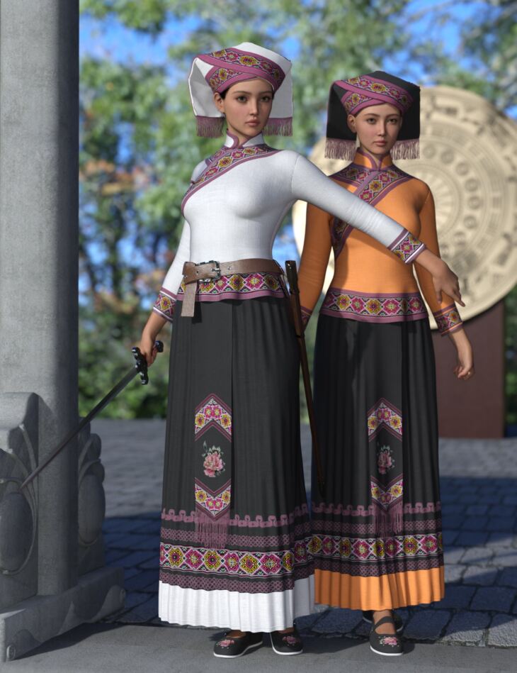 The dForce MK Zhuang Outfit for Genesis 9 is a stunning costume designed for Genesis 9 figures.