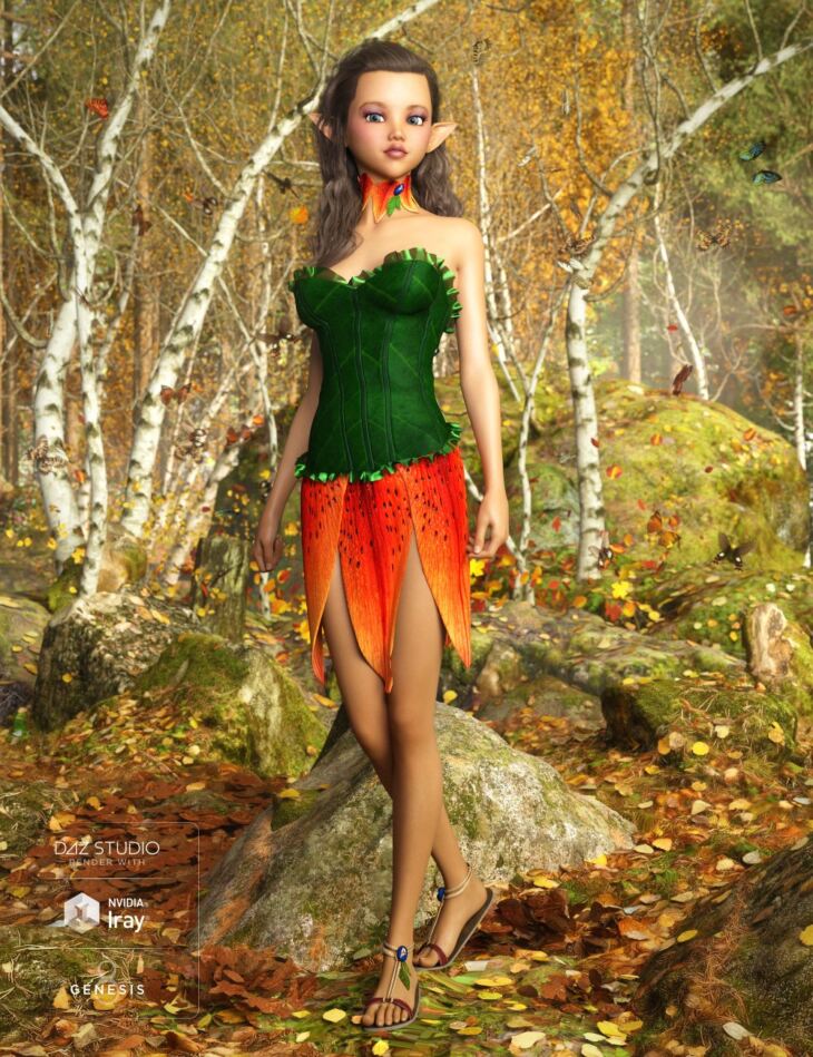 A highly detailed outfit for a woodland elf or fairy consisting of a Collar, Dress, Panty & Shoes.