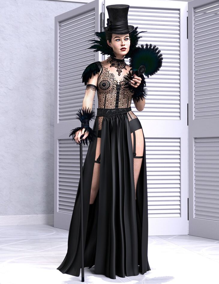 The Neo-Victorian Outfit is perfect for historical or gothic renders, as well as portraits thanks to its highly detailed jewelry and feather accessories. You will get two sets of materials in this set: a gothic black and a classy gold set. They are easy to apply. No need to select the items, each item can be changed from Genesis.