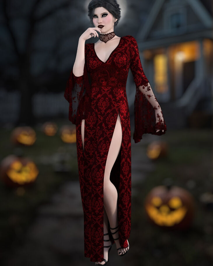 Drape your girls in Gothic finery in this exquisite gown and collar set for Genesis 8. Perfect for your favoite vampire or witch this dress is a must have for Spooky Season.dforce is required for the dress.