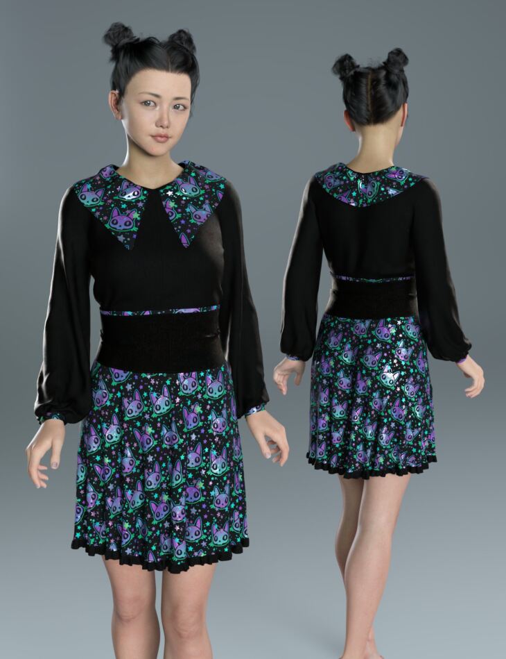 The dForce Pityu Outfit for Genesis 8 and 8.1 Female is an outfit for innocent, gothic, or elegant characters!