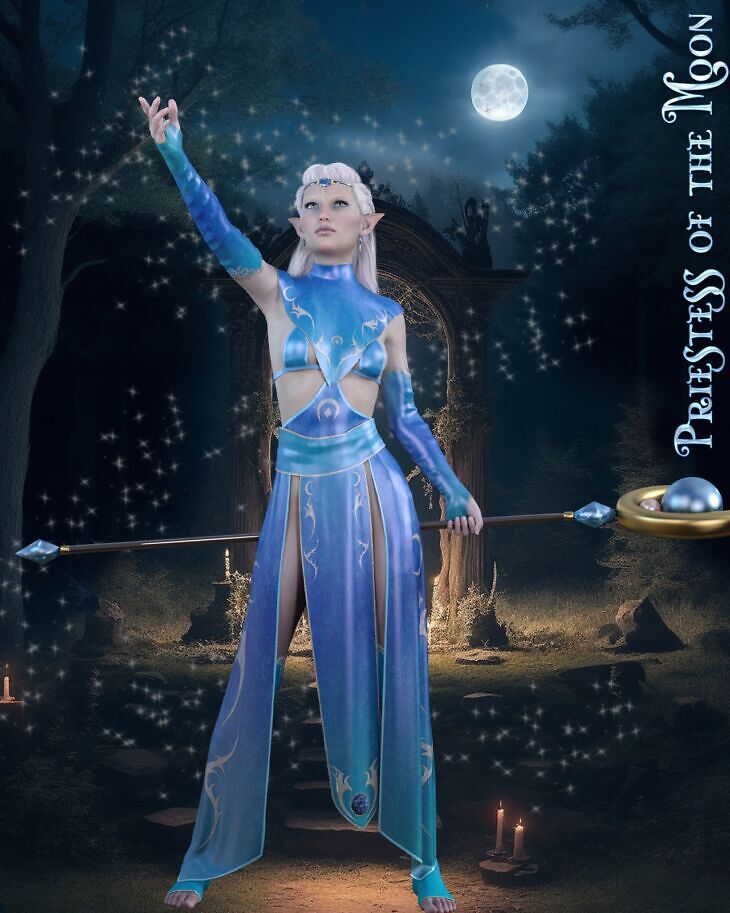 Bring your fantasies to life with this beautiful fantasy outfit for Genesis 8. Worship at the altar of the moon Goddess in this detailed ensemble.