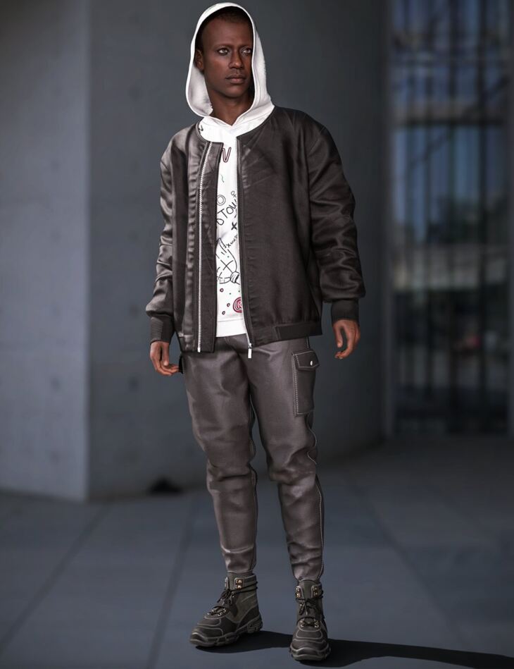dForce Ready To Wear Outfit for Genesis 9 is an urban-style set of clothing that consists of pants, a hoodie, sneakers, and a jacket.