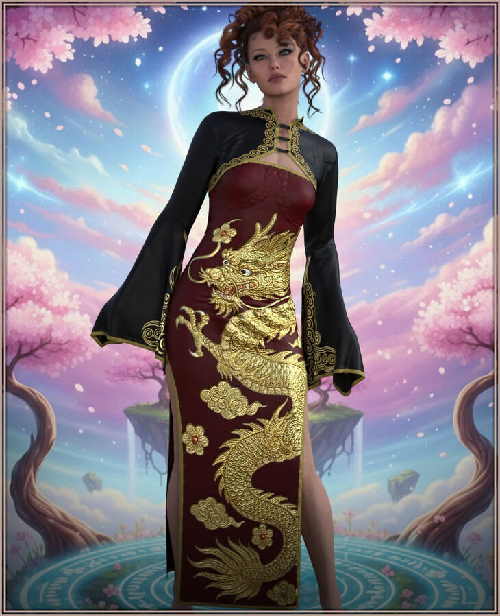 It includes a long, fitted cheongsam, a flowing qipao shrug and 05 styles for each piece in Iray ONLY.