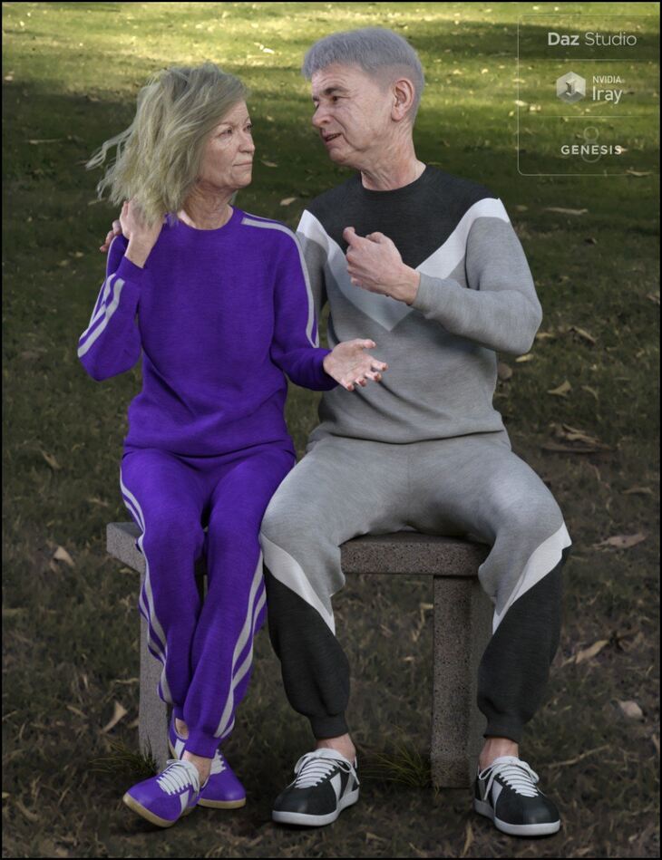 A comfy casual set for all your Genesis 8 female and male characters: Sweatshirt, sweatpants, and athletic shoes. dForce is not required!
