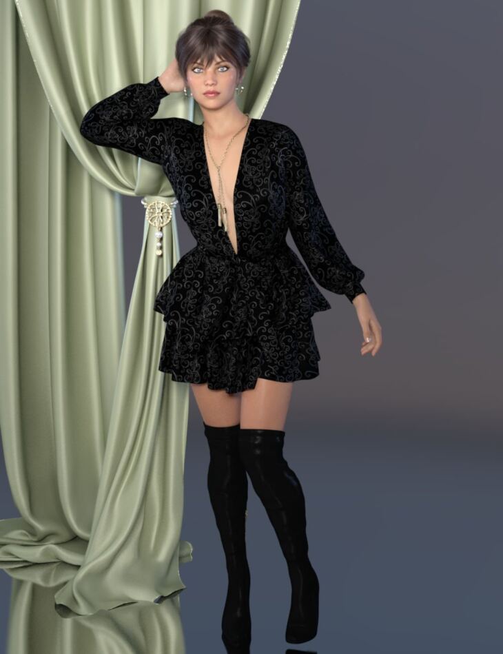 The dForce Riley Outfit for Genesis 8 Female(s) is a fun ruffle dress with panty and thigh-high boots in 6 textures