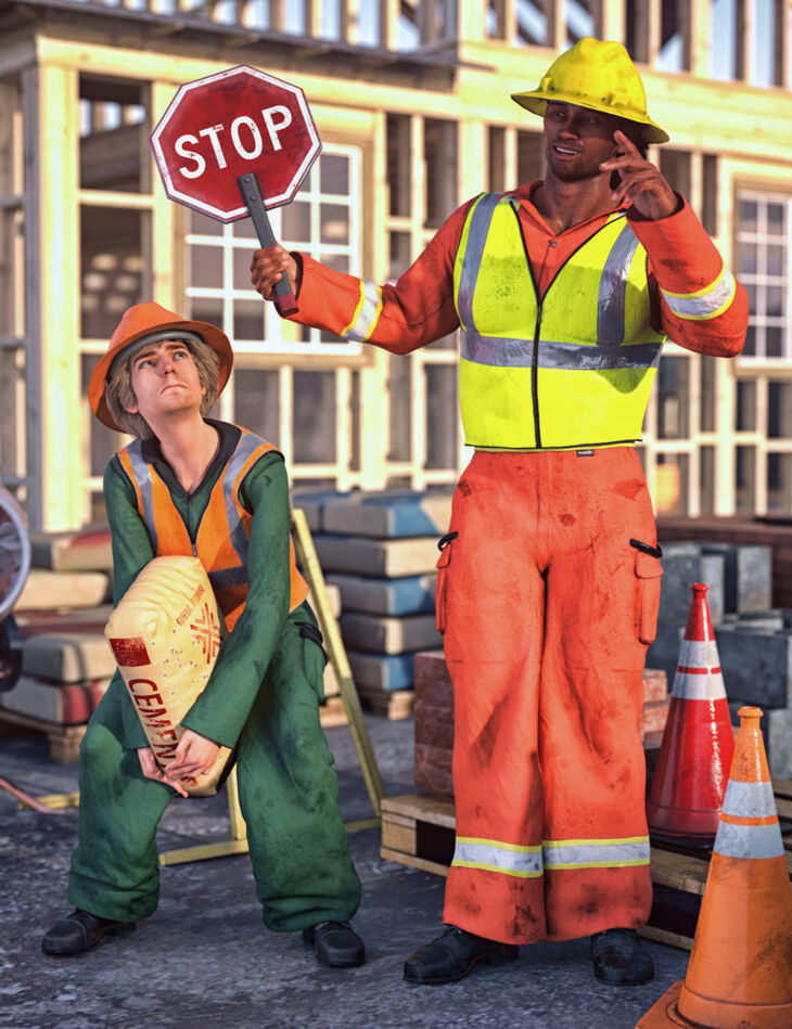 This outfit comprises a sign, cone, vest, suit, boots, boot mask, and hat. The dForce Road Work set supports lots of shapes and widen morphs to fit Genesis 8 Males in most poses.