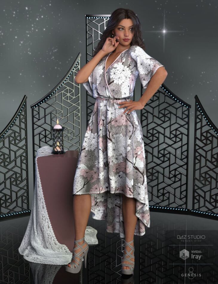 Roxanne is a loose-fitting, flowy dress with a high-low skirt, elbow-length sleeves, and a cross-over top with flirty neckline. To complement the dress, high-heeled, strappy sandals are included. Six beautiful textures are included for both the dress and sandals, making it the perfect dress for summer.