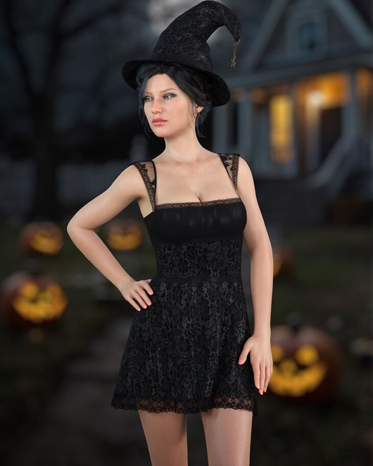 Embrace the spooky spirit in this bewitching little mini dress for Genesis 8. Great for Halloween or any time of the year. Bonus witch hat included.