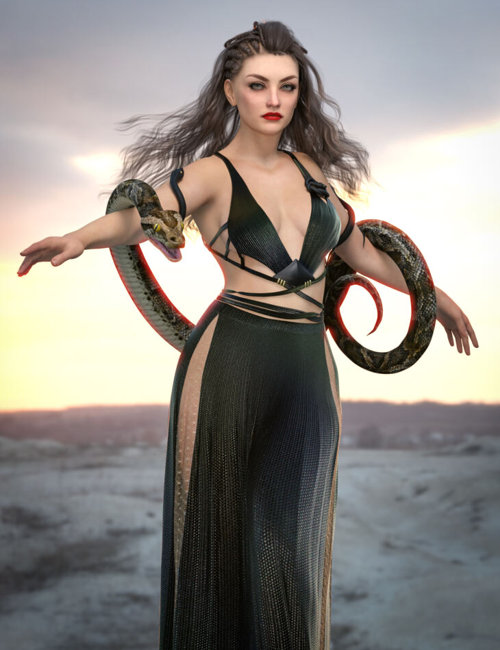 dForce Siren of Snakes Outfit for Genesis 9 is a Medusa-inspired outfit that embraces both the allure and danger associated with the mythical Gorgon and will leave a lasting impression.