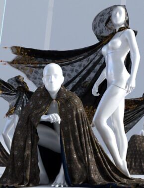 A set containing cloak, hood and decorative pins for Genesis 3 Female, Genesis 8 Female, Genesis 3 Male and Genesis 8 Female (4 sets in total) modeled after historical cloaks worn over armor.