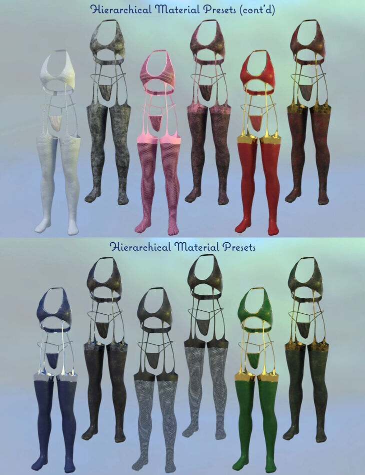 The set includes some hierarchical material presets for changing the look of the outfit.