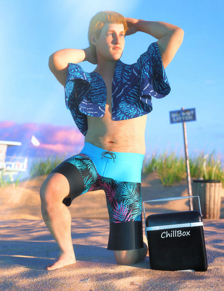 dForce Swim Gear for Genesis 8.1 Males includes a pair of swim trunks, a towel, and a cooler for all your swimming adventure scenes!