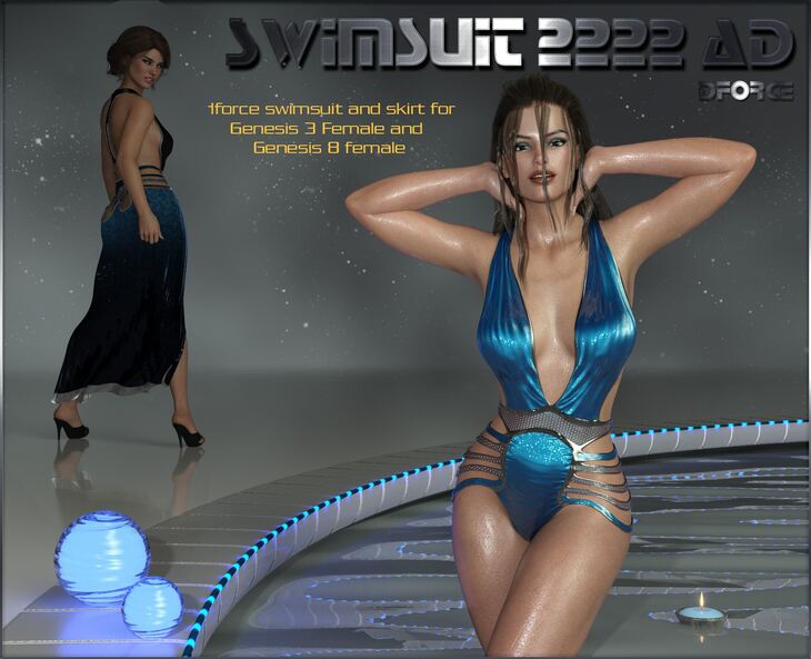 Futuristic elegant swimsuit and skirt for Genesis 8 Female and Genesis 3 Female. Every wrinkle has been created by hand to get a most realistic fold education. The whole swimsuit was created with great attention and love to detail.