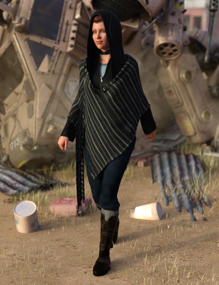 The Wander Outfit is a boho-style outfit for Genesis 8 Female that contains a shawl, hoodie, t-shirt, pants, boots, a choker and faux knee heights.
