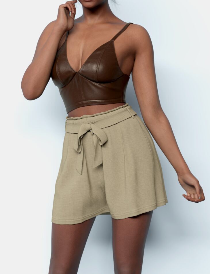 Fill your Genesis 9 wardrobe with this set of casual clothing including wide shorts with a belt and big bow and a crop cami top.